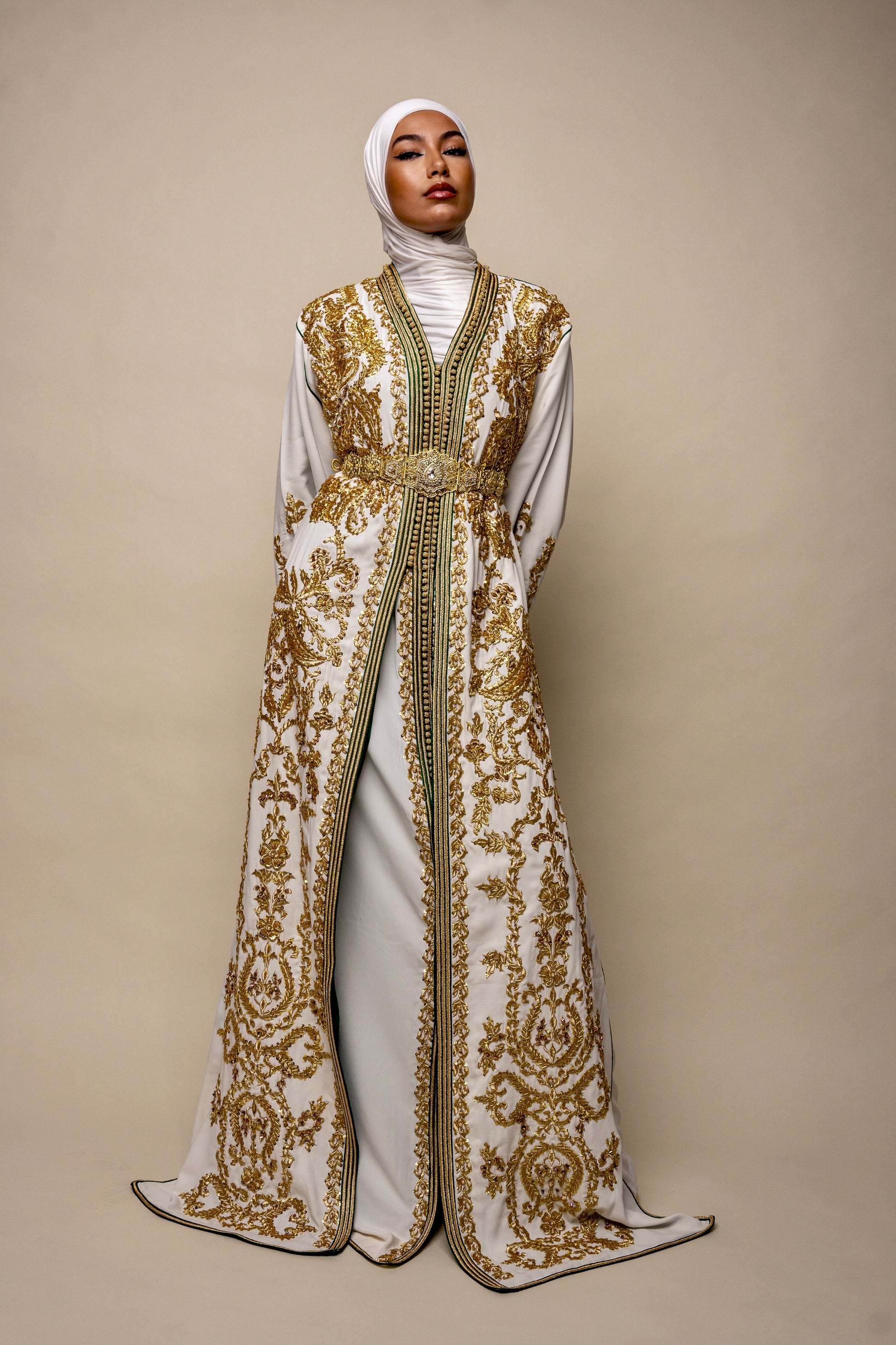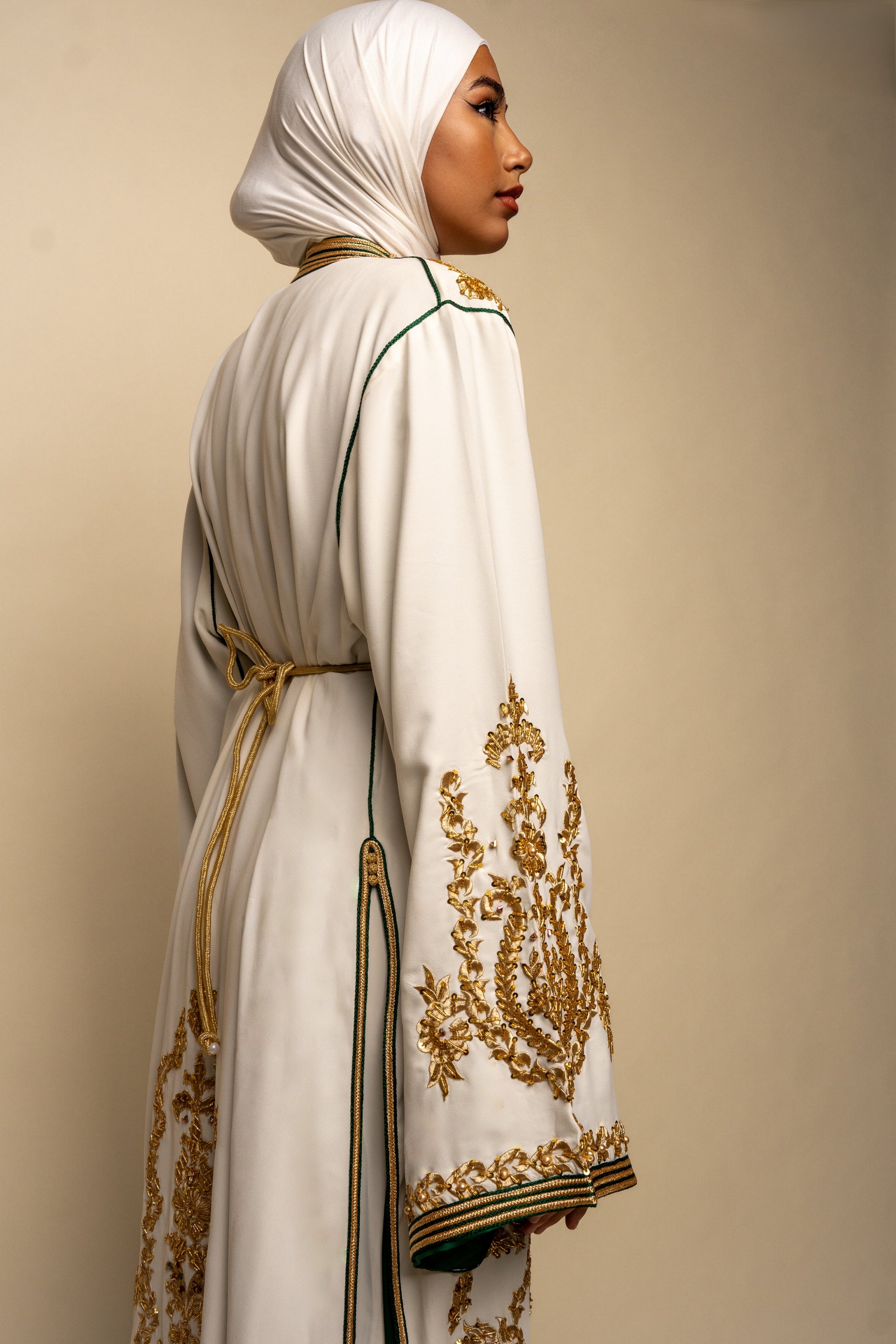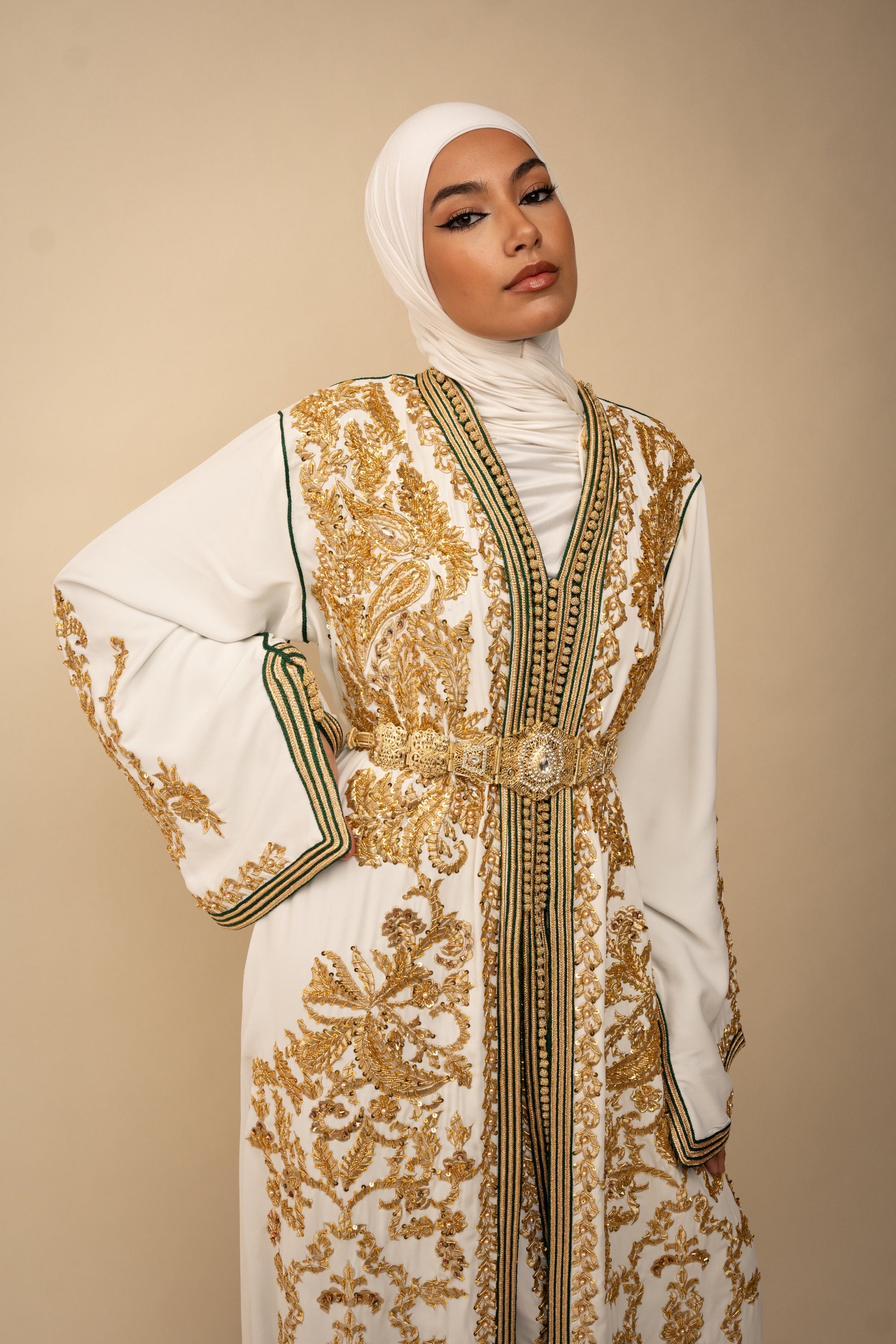 This elegant bridal tkshita features a luxurious white base with intricate hand embellished gold embroidery, beautifully accented by a subtle green inner layer. Finished with a matching belt, it’s the perfect choice for a bride seeking timeless elegance.
