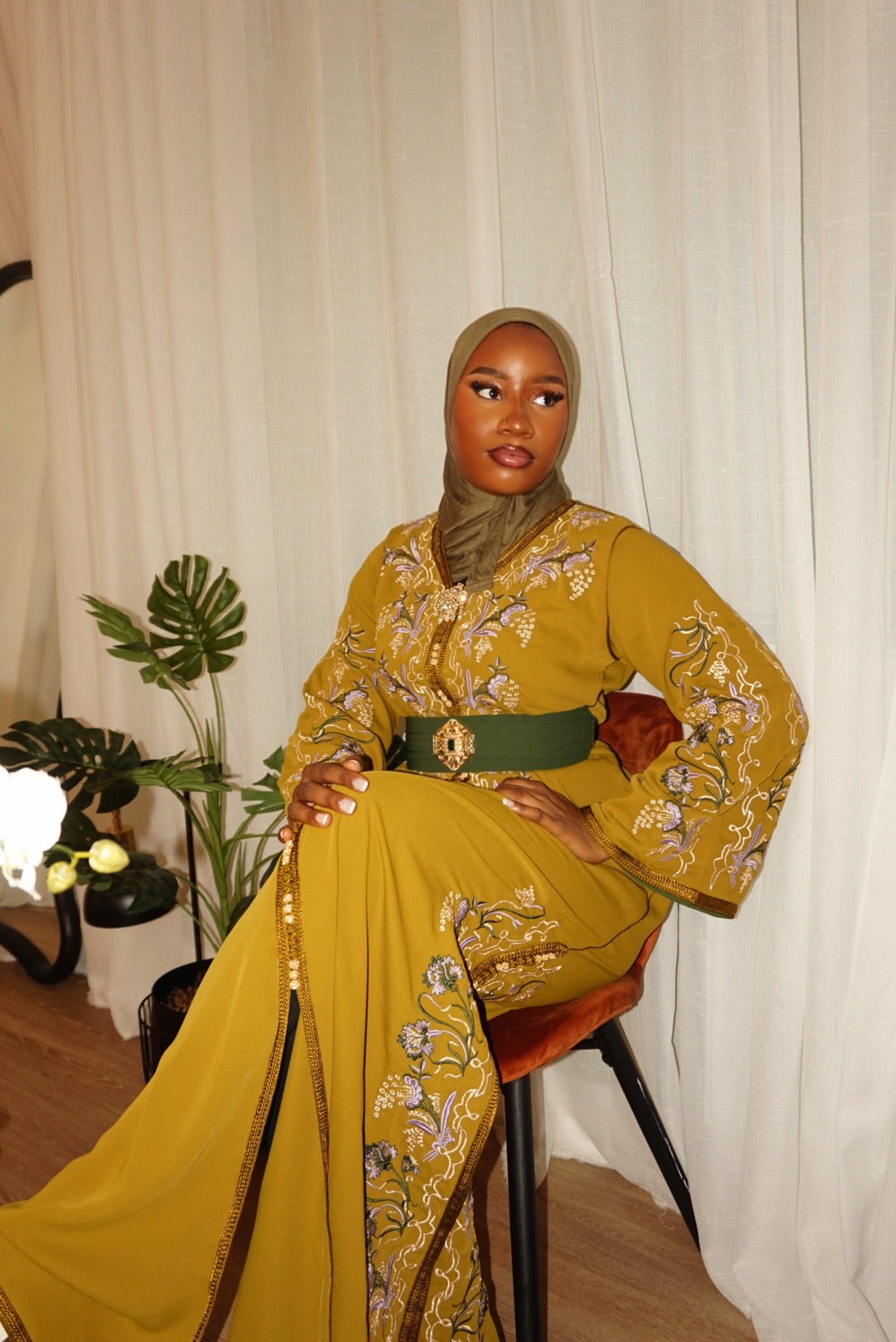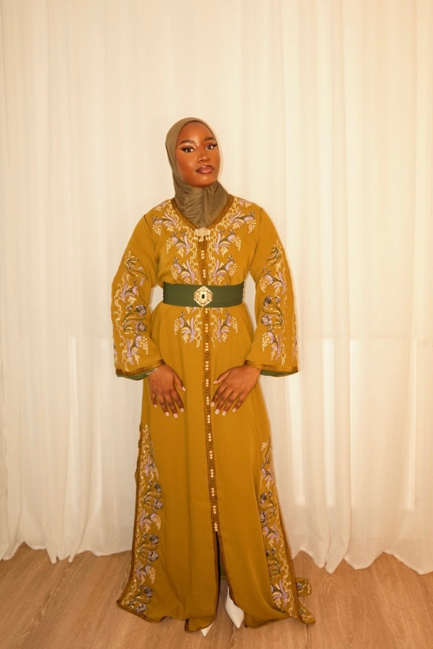 The Liyana Kaftan is adorned with soft lilac and gold embroidery on a deep mustard base. Its elegant detailing and structured belt create a timeless and graceful look.