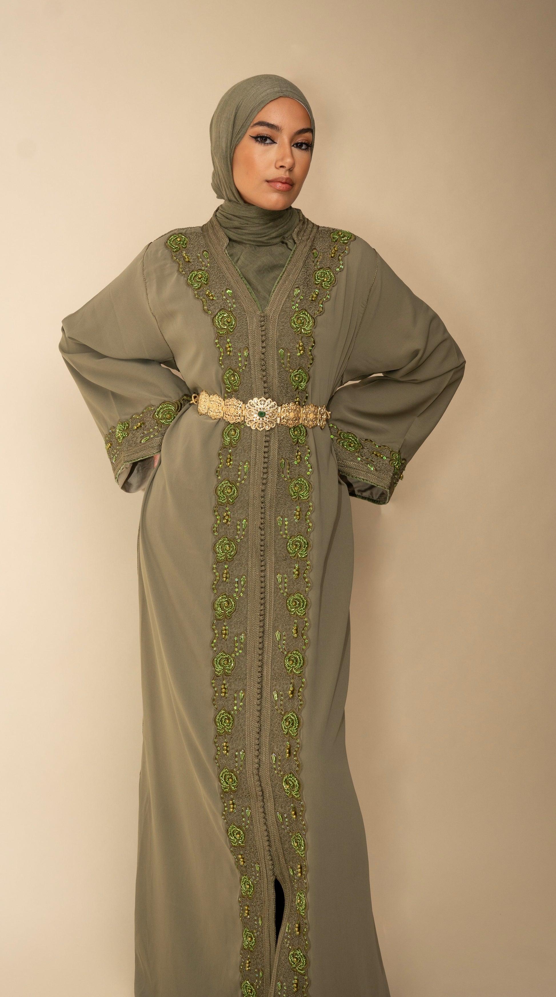 The Noor Kaftan in olive green is adorned with intricate embroidery and a statement gold belt. A refined piece that embodies grace and timeless style.