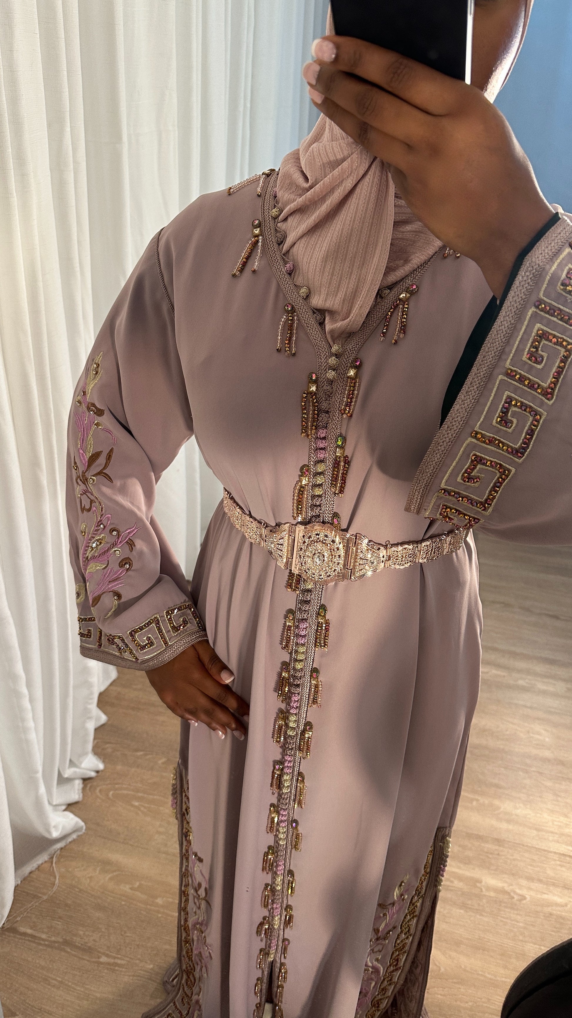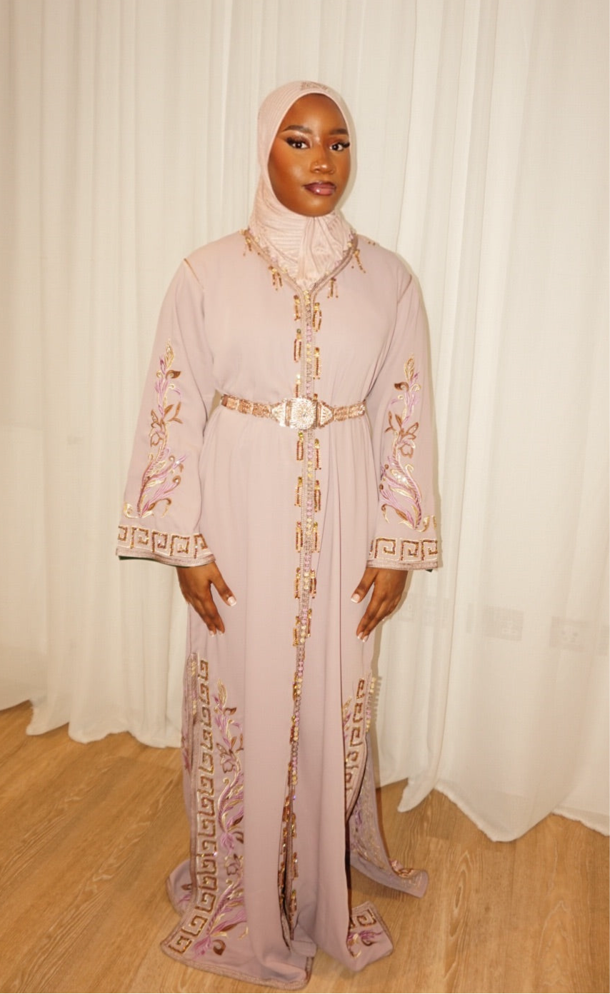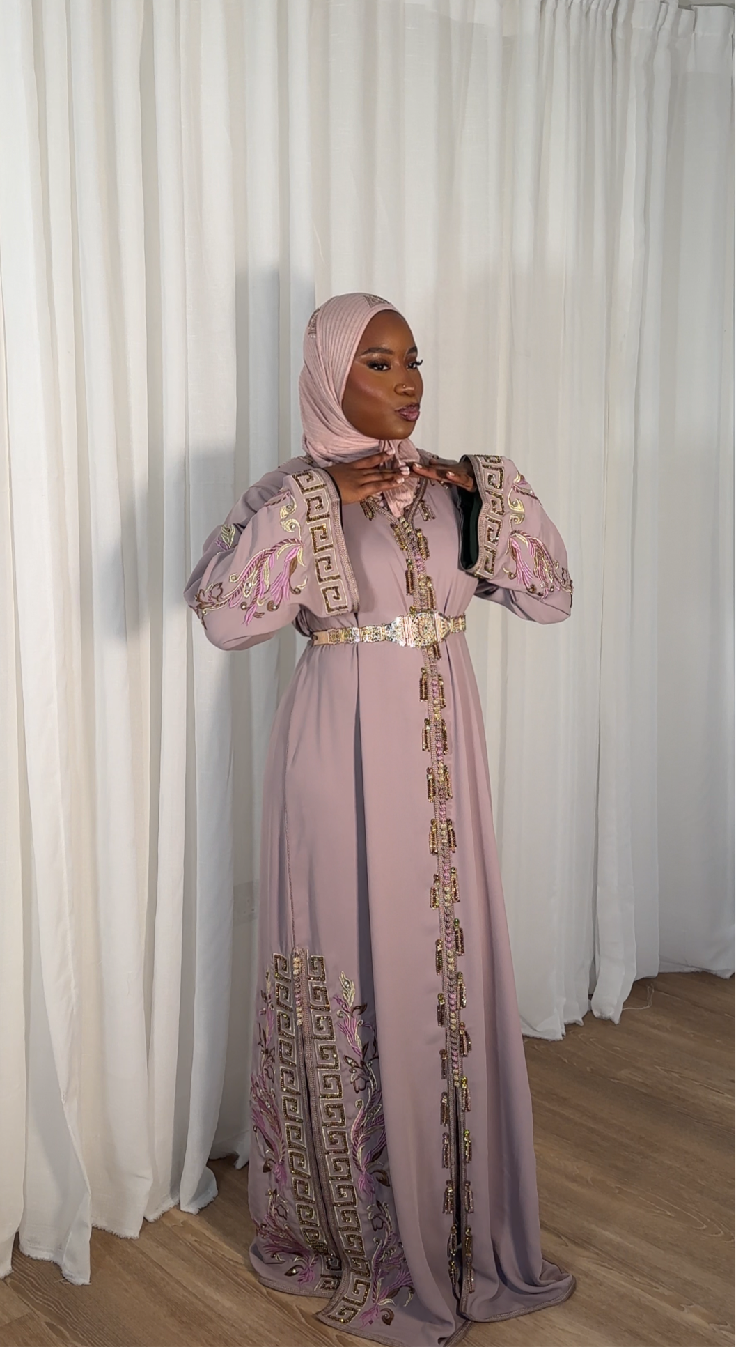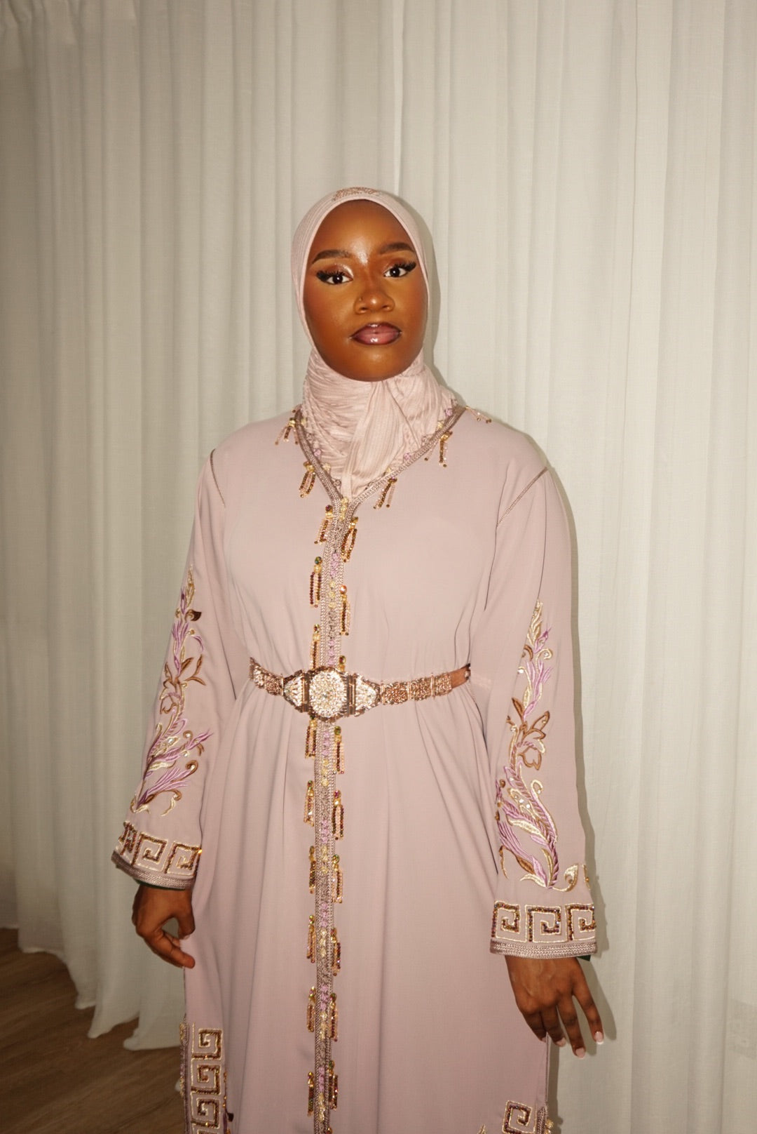 The Omnia Kaftan radiates elegance in blush pink with detailed gold and soft pink embroidery. A graceful design that blends modern charm with timeless sophistication.