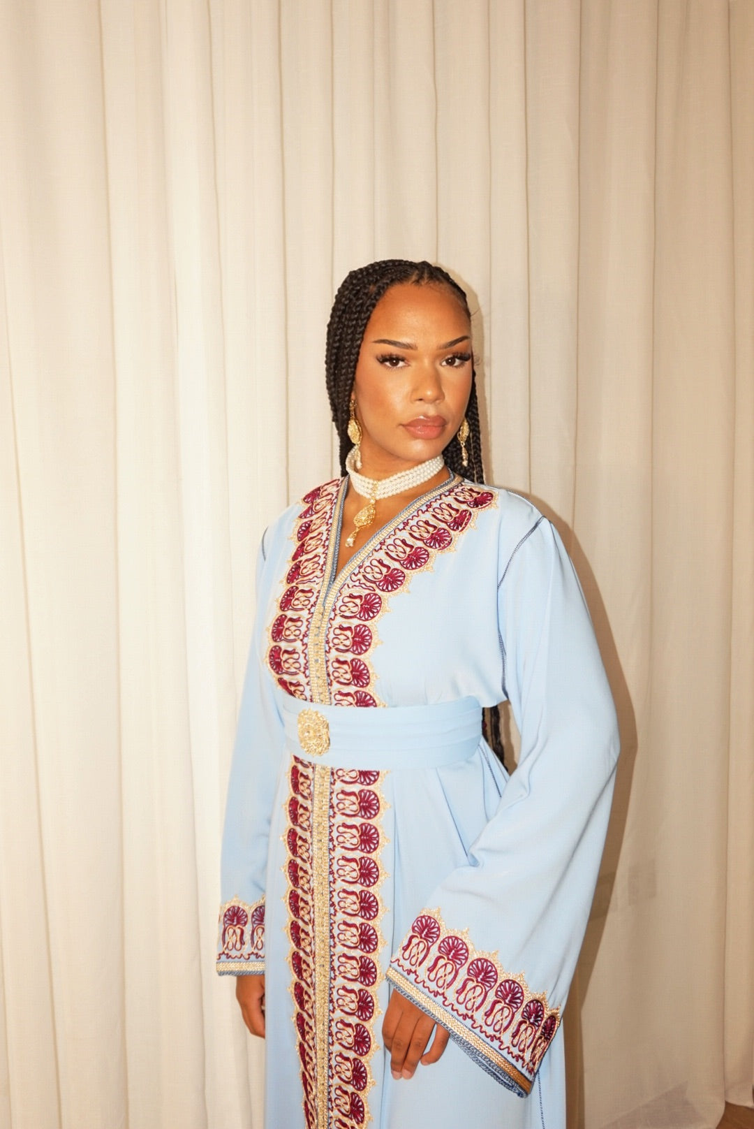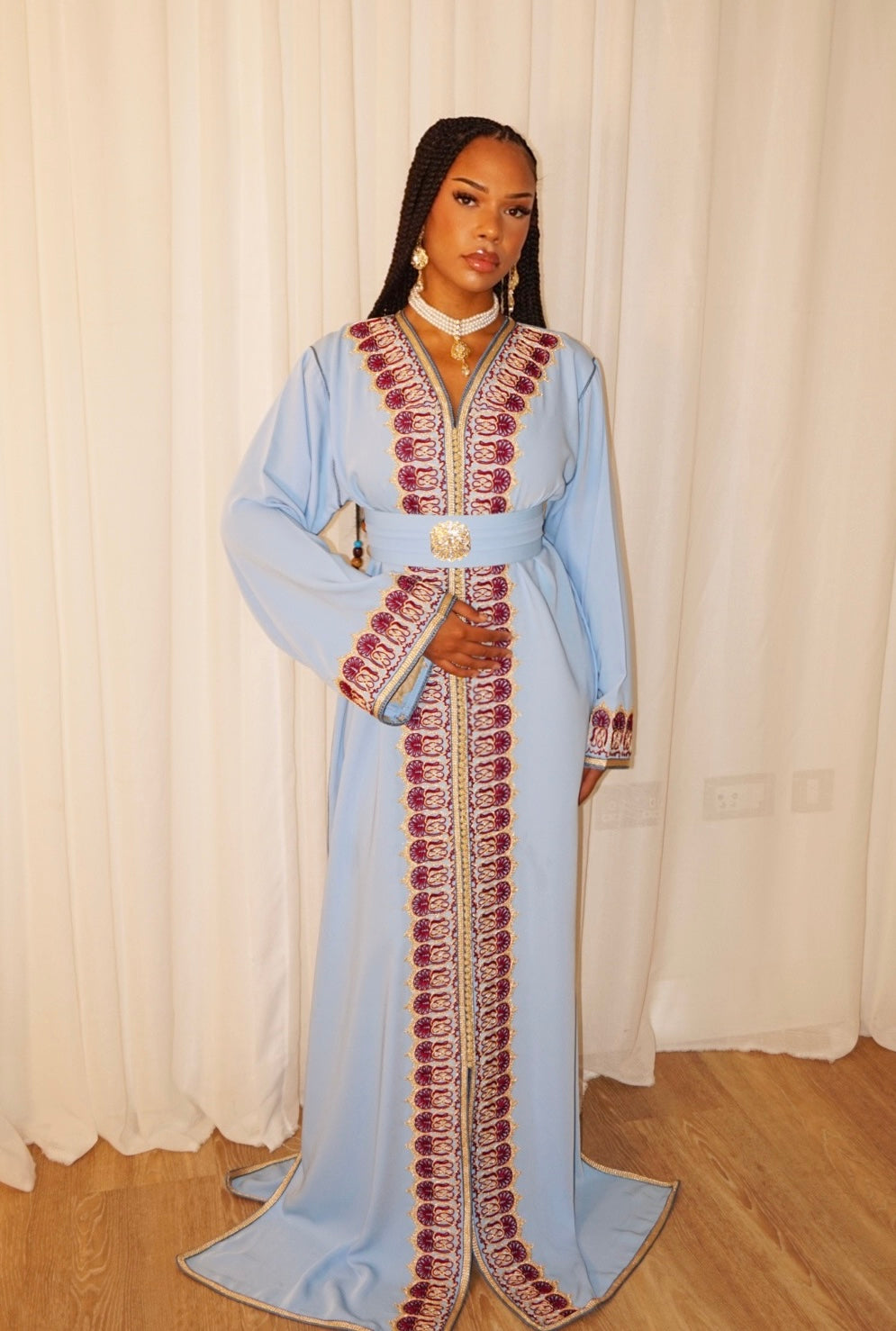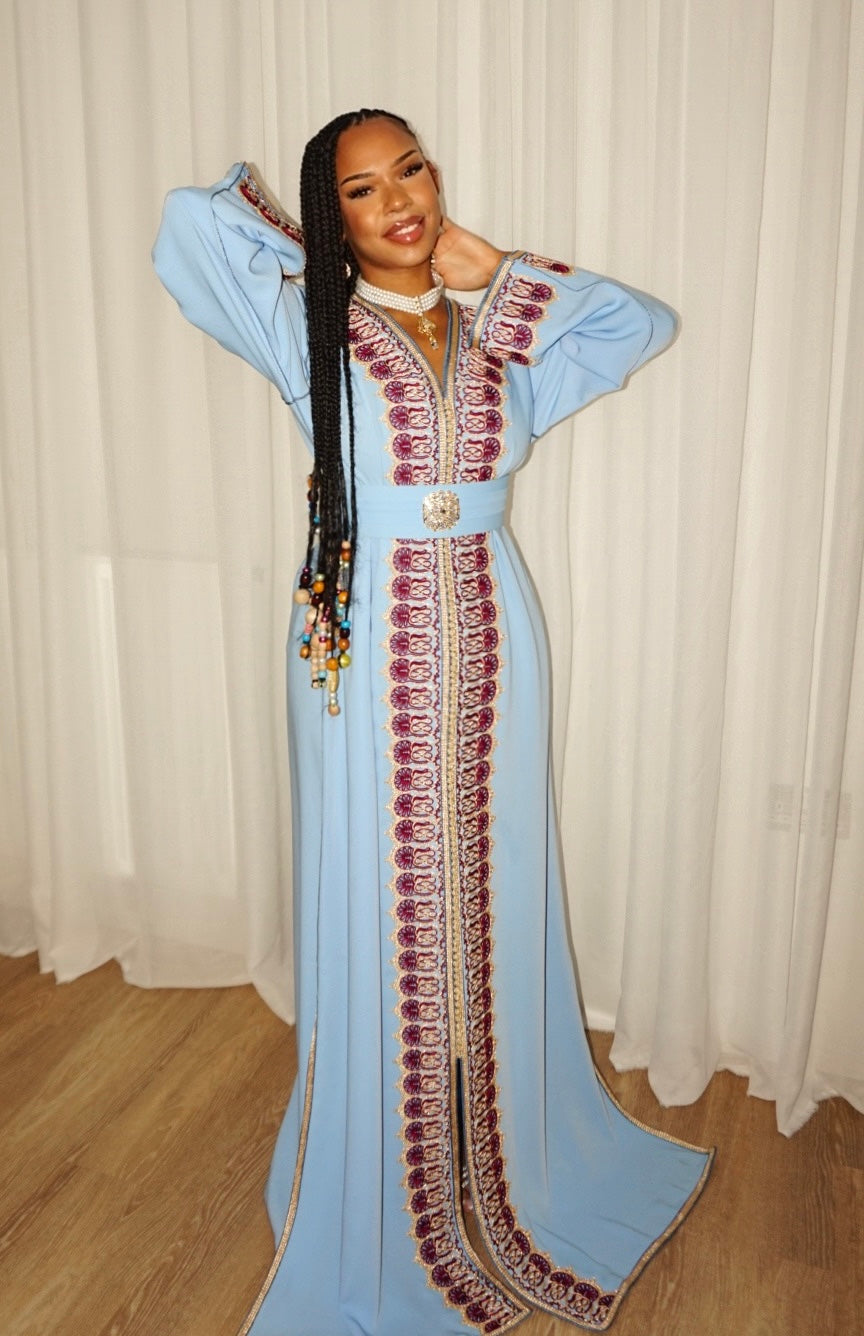 The Saphira Kaftan radiates charm in soft blue with intricate burgundy and gold embroidery. A statement of sophistication and beauty.